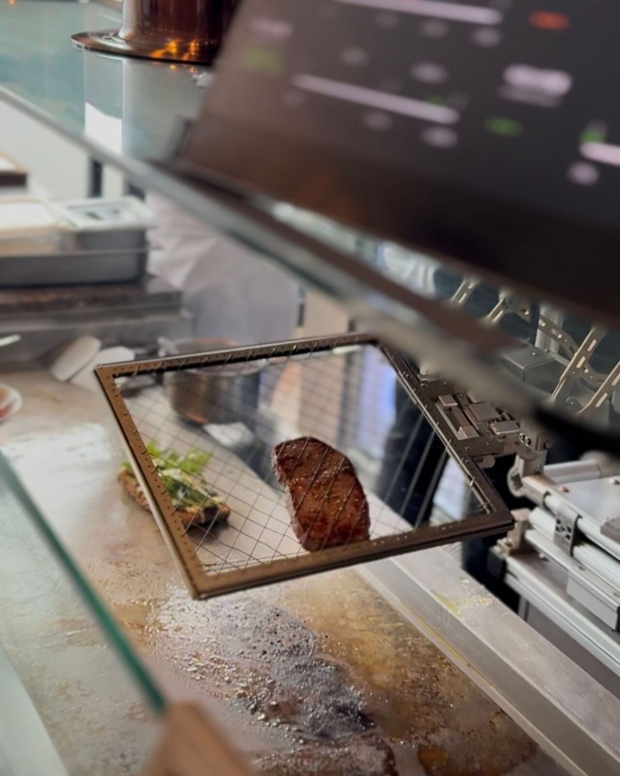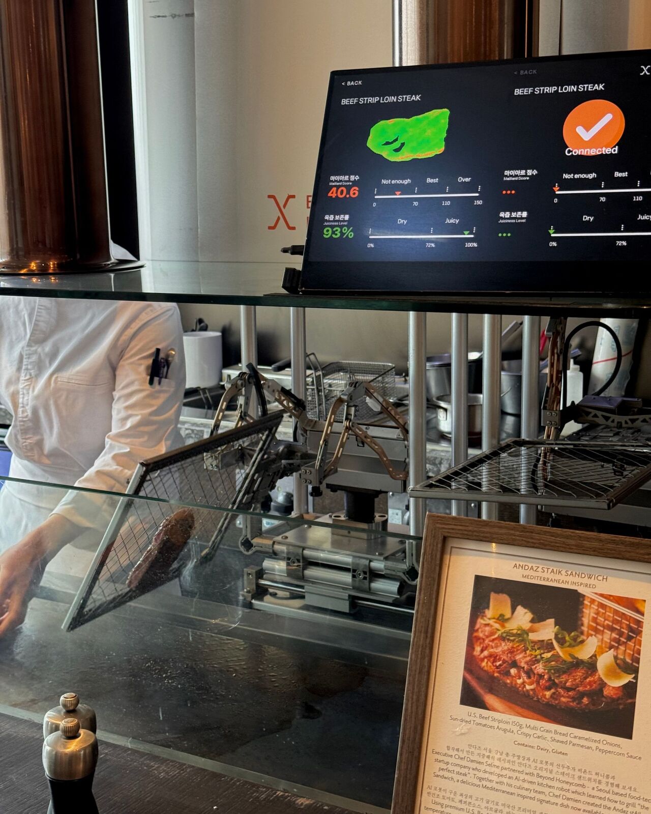 이 로봇의 정체는 바로 스테이크를 구워주는 ‘AI 셰프 그릴 로봇’이었어요. 로봇셰프의 철판 사이에 끼어 앞뒤로 회전하는 저 스테이크, 저희가 주문한 ‘안다즈 AI 스테이크 샌드위치’를 만들기 위한 조리 과정 중에 있었네요🤣