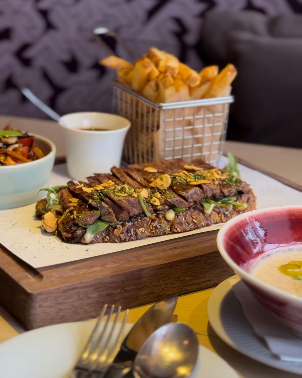 드디어 주문했던 샌드위치가 나왔습니다! 바삭한 곡물 빵 위에 올라가는 프라임 등급의 채끝 스테이크와 캐러멜라이즈 양파, 선 드라이 토마토가 한데 어우러져 깊은 풍미를 냈어요. 도저히 로봇이 구운 스테이크라고 상상할 수 없는 맛이었답니다. 정말 손맛까지 복사가 가능한 시대가 왔나봐요🥹 저희는 세트 메뉴를 시켜서 양송이수프가 함께 나왔는데, 짭조름한 스테이크 샌드위치와 번갈아 먹으면 맛잘알인거 아시죠? 너무 부담스럽지도 않고 맛과 가성비를 챙긴 식사였어요.