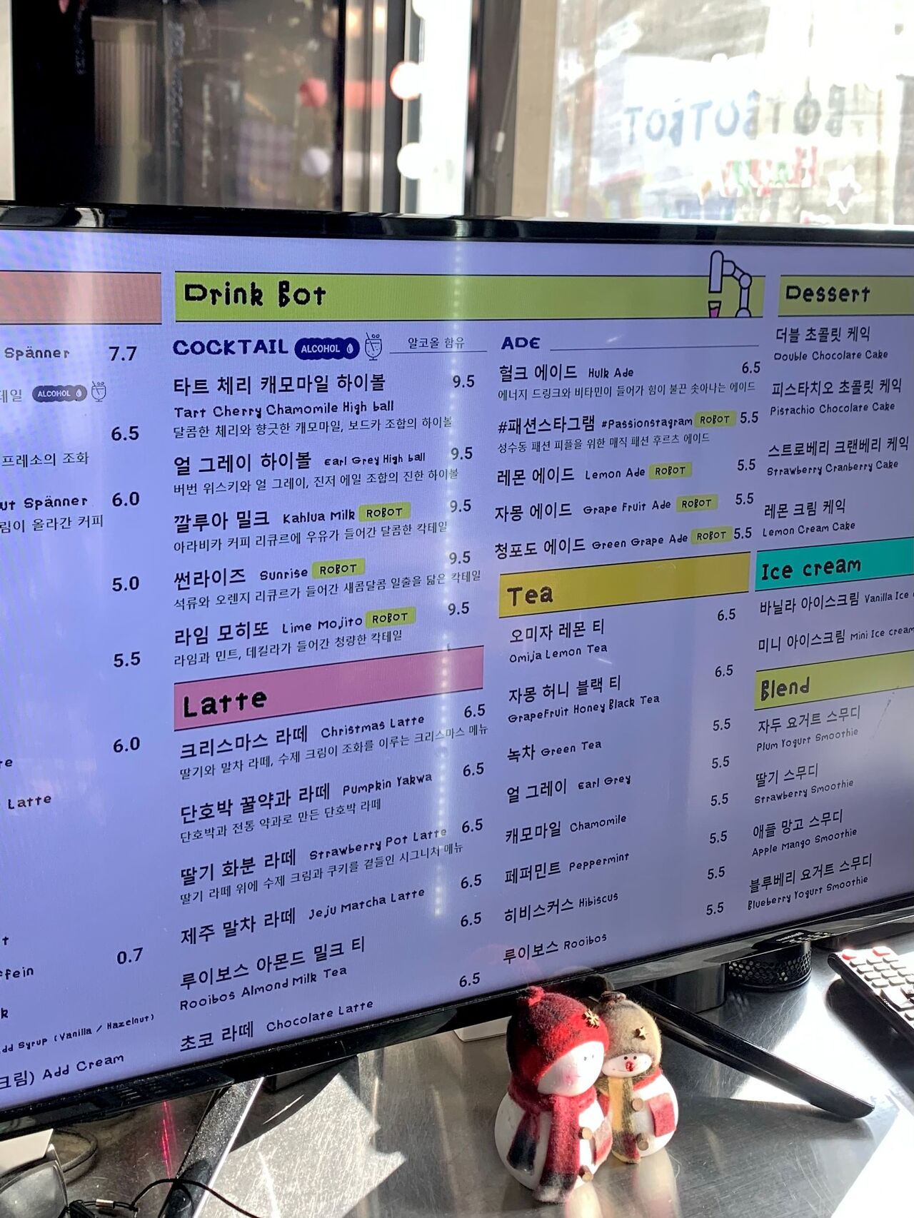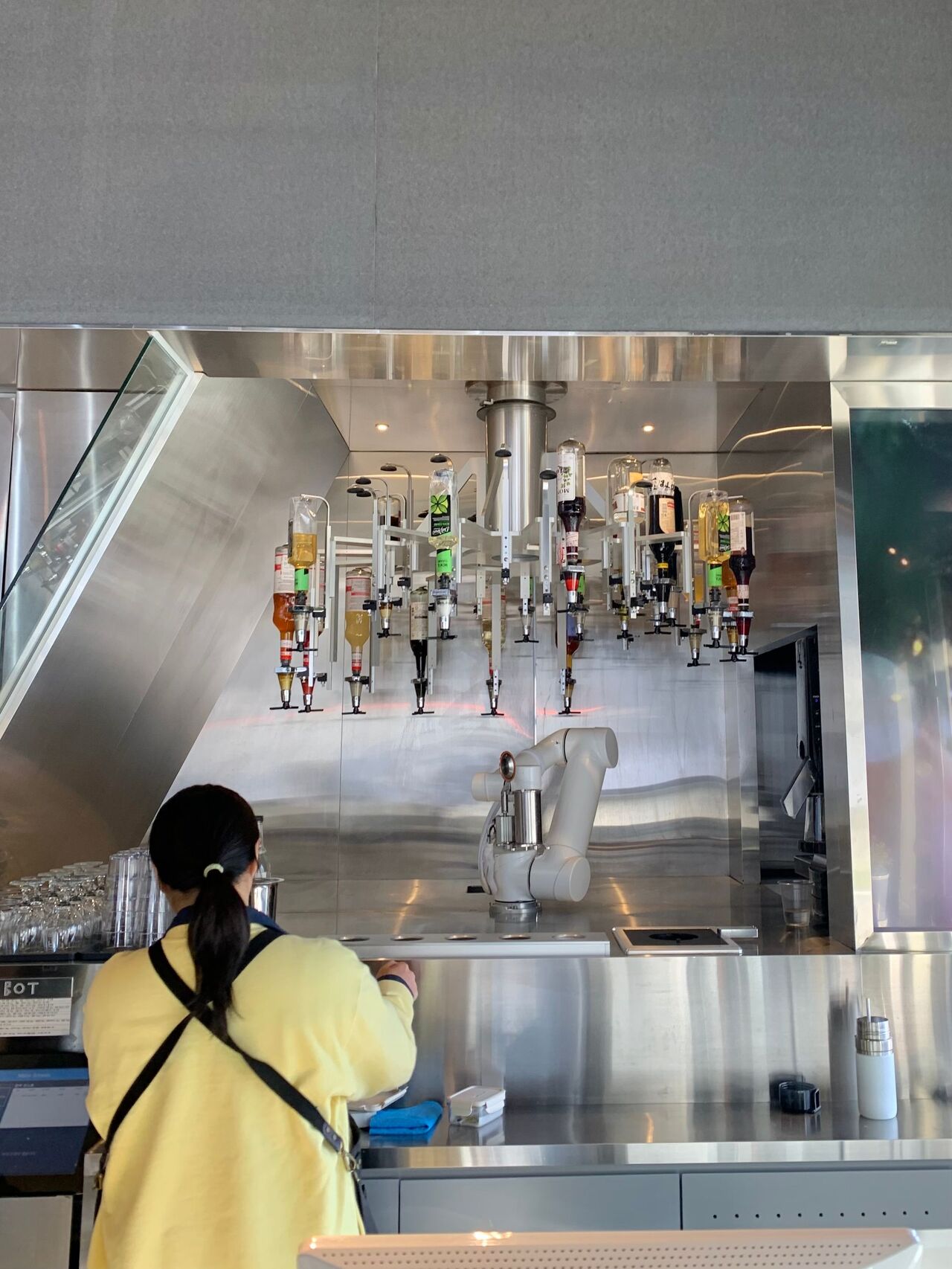 이 로봇들이 담당하는 음료나 디저트는 메뉴 이름 옆에 노란색 표시가 붙어있어 골라서 주문하기 편하더라고요. 아쉽게도 제가 방문한 날은 커피 담당 로봇과 케이크 담당 로봇이 쉬고 있었어서 칵테일로 선택을 해보았습니다. ’저 로봇이 칵테일을 제대로 만들 수 있을까?’ 하는 의심이 들었거든요 🧐