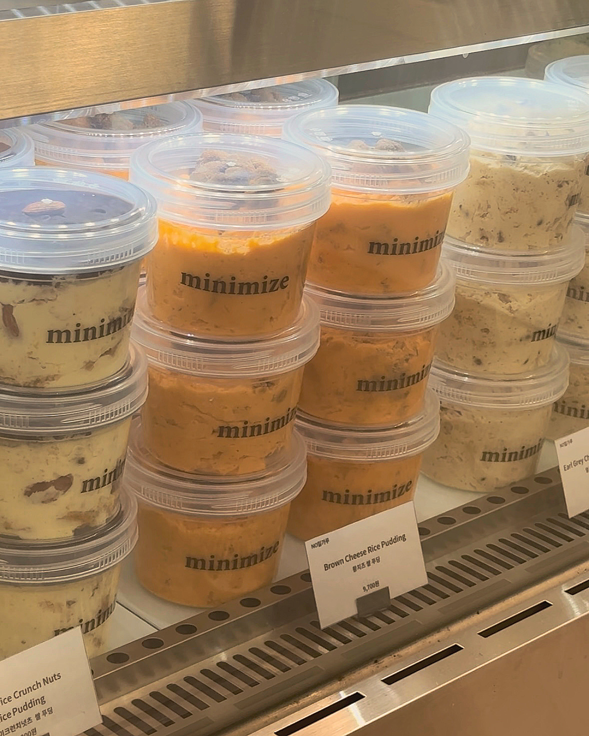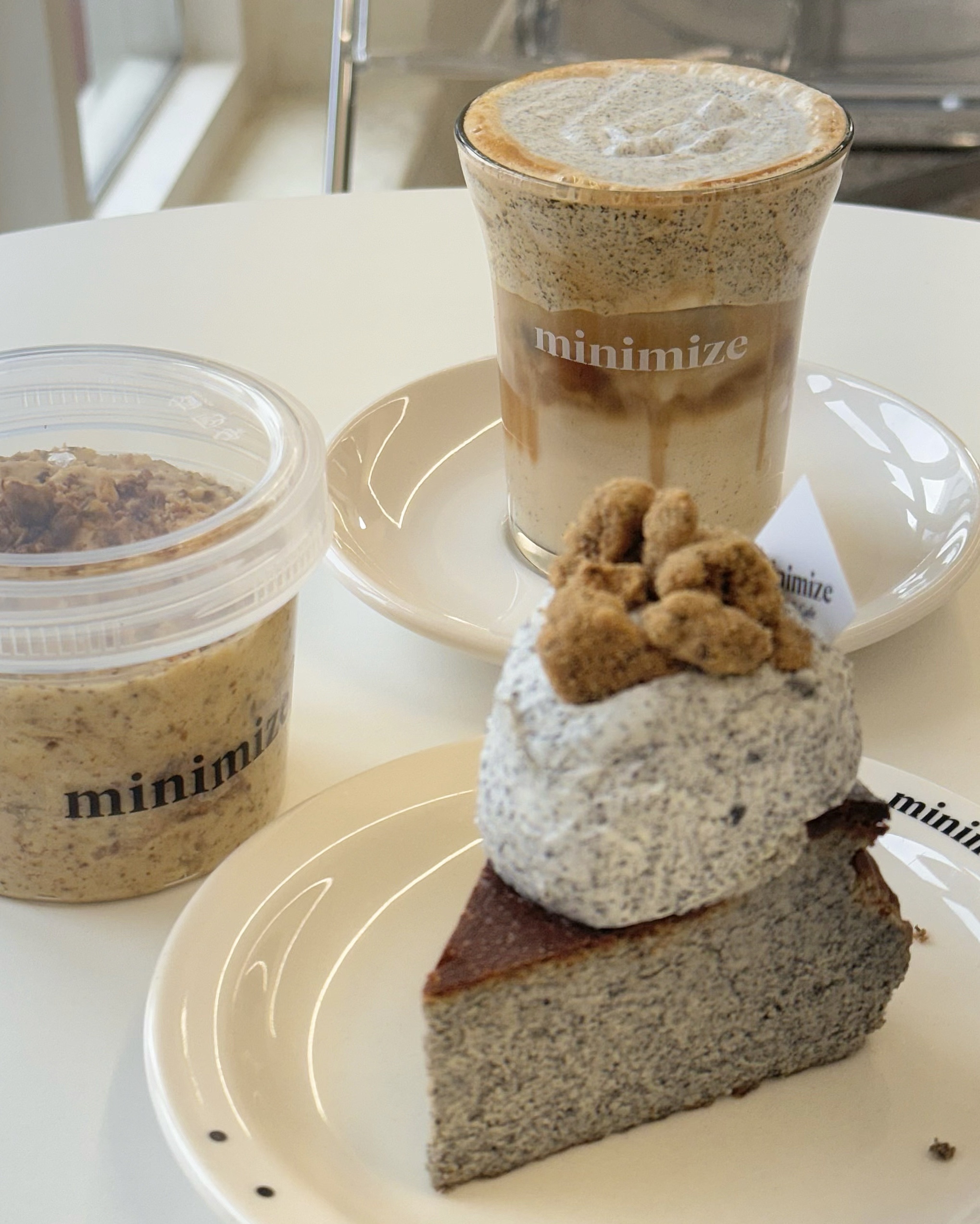 “쑥, 고구마, 단호박, 흑임자… 이런 재료들은 기본적으로 고소한 맛이 강해서 왠지 살이 안 찔 거 같은 느낌이잖아요. 맵고 자극적이지 않으니까요! 그런데 할매 입맛 저격하는 디저트들이 대부분 고칼로리·고과당·고지방 등 3고(高) 식품이라고 해요. 더욱이 한식 디저트는 탄수화물 함량이 높은 걸로도 잘 알려져 있죠. 방심하고 먹었다가 다이어트는 또다시 내일부터… ‘레트로가 아닌 뉴트로라면 조금 더 영리해야겠죠?’ 미니마이즈는 밀가루와 글루텐 없이, 오롯이 국내산 재료들로 꾸덕하고 진한 치즈케이크와 쌀푸딩을 만들어요. 강하게 느껴지는 원물 맛이 이곳만의 특징이죠. GI 지수가 낮은 코코넛 슈가로 당 걱정도 낮추다니… 다이어터들의 입터짐 방지템으로도 참 유명하던데! 과연 21세기 디저트다운 *영리한 맛의 복고(retro)*네요.”